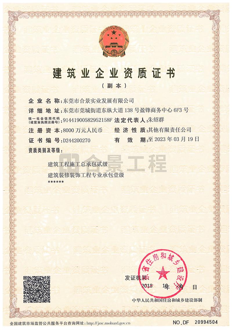 20181122日,合景實(shí)業(yè)公司喜訊頻傳。上午,公司從市政市場迎來好消息,成功中標(biāo)寮步鎮(zhèn)市政升級改造項(xiàng)目工程。下午,喜訊接踵而至,公司在市場準(zhǔn)入資質(zhì)上又有新斬獲,成功升級為“建筑裝修裝飾工程專業(yè)承包壹級”企業(yè)。
